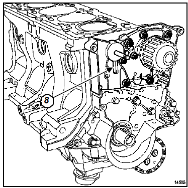 - Veiller à ce que l'ergot (14) du galet tendeur soit correctement